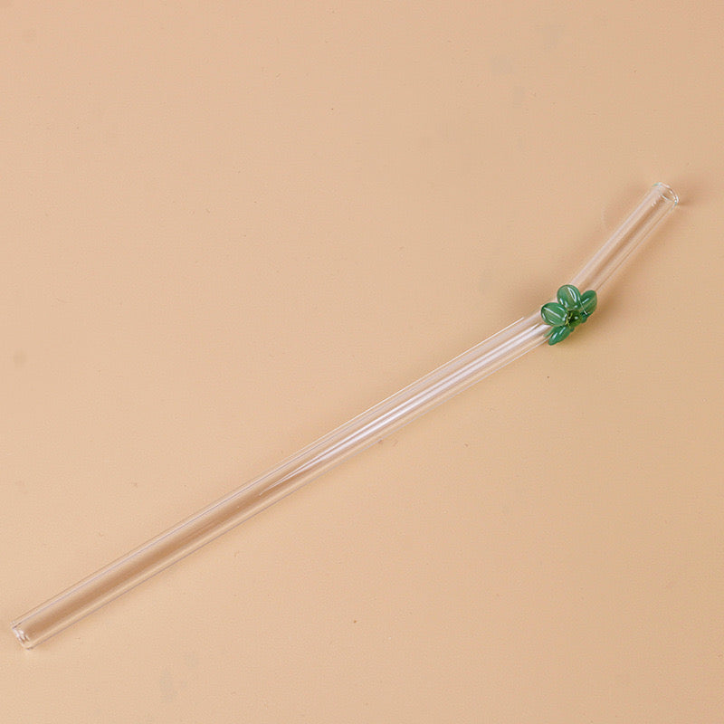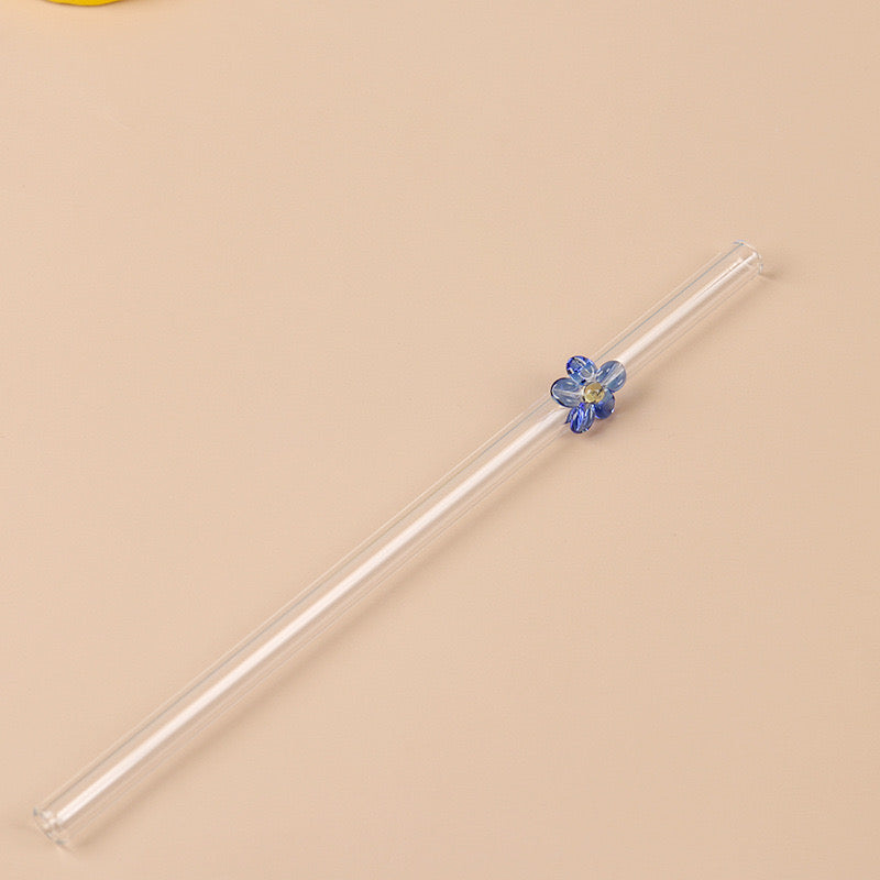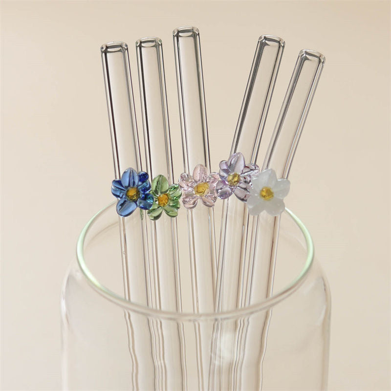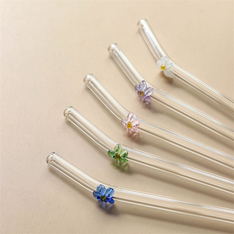 🌸 Design: Clear glass straws adorned with small, intricate flower embellishments near the top for a whimsical touch.